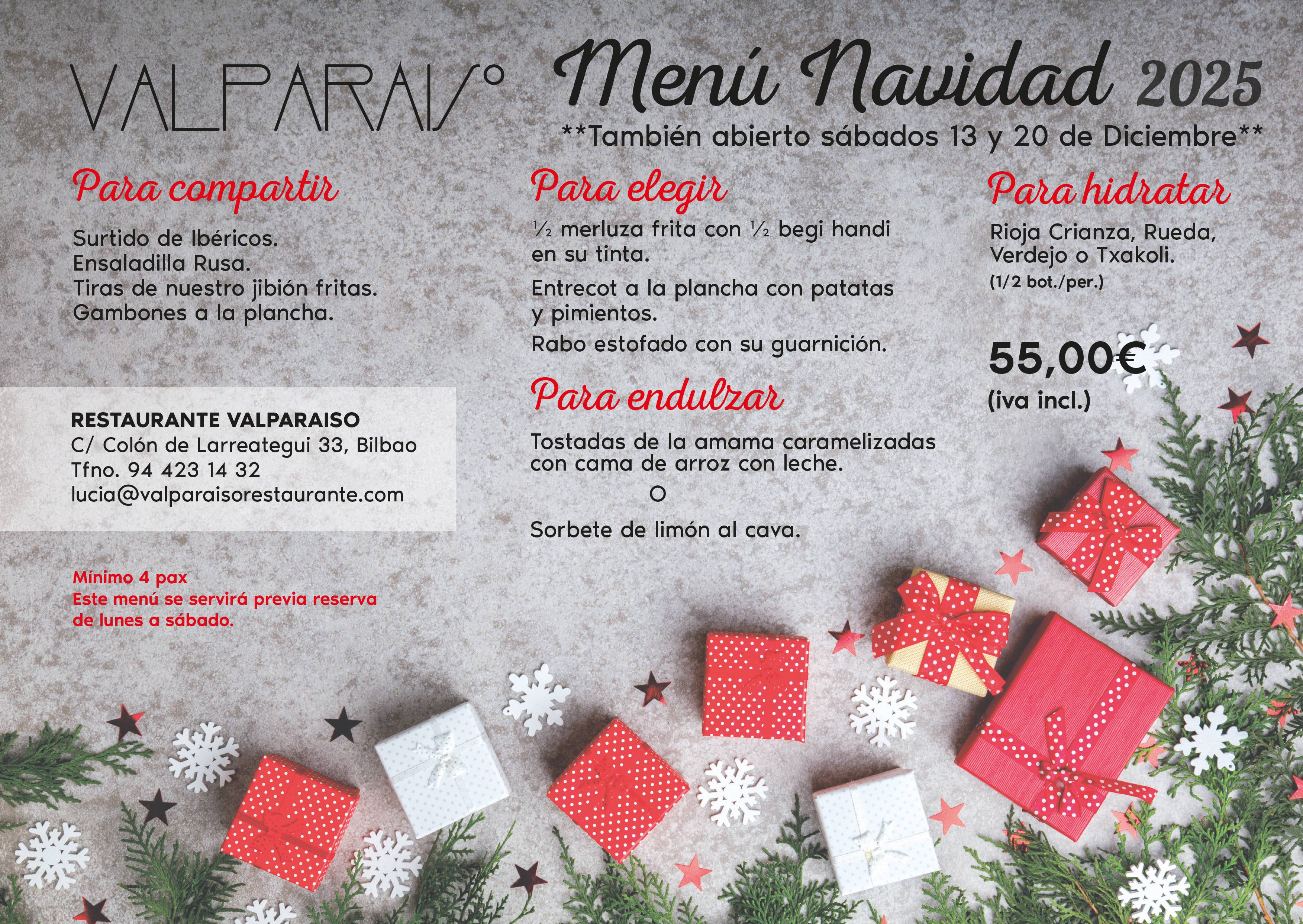 Disponemos de menús especiales confeccionados a medida para grupos durante todo el año bajo reserva así como un menú Aste Nagusia en fiestas de Bilbao y un menú de Navidad.